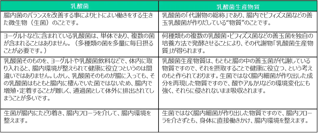 乳酸菌生産物質とは、乳酸菌の「代謝物の総称」であり、腸内でビフィズス菌などの善玉乳酸菌が作りだしている物質のことです。通常、ヨーグルトなどで摂る乳酸菌はもともと腸内に棲んでいた菌ではないため、体内に入れても、腸内で増殖・定着することがなかなか難しく、菌として体外に排出されてしまうことが多いです。それに対して、生菌ではなく腸内細菌が作り出した成分である「乳酸菌生産物質」は物質ですので、腸内での環境変化に強く、腸内フローラを介さずとも、身体に直接働きかけ、腸内環境を整えます。