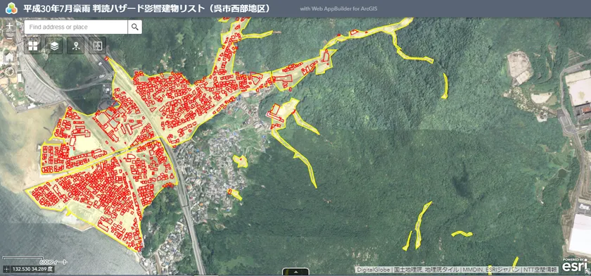 今回公開した「被災状況マップ」は、平成30年7月9日及び11日に撮影した広島県坂町周辺及び広島県呉市西部地区の発災後の空中写真(国土地理院正射画像)からハザードエリアを独自に判読、推定し、被災前の建物枠データを重ね合わせ、ハザード影響建物リストを表したマップを掲載しております。