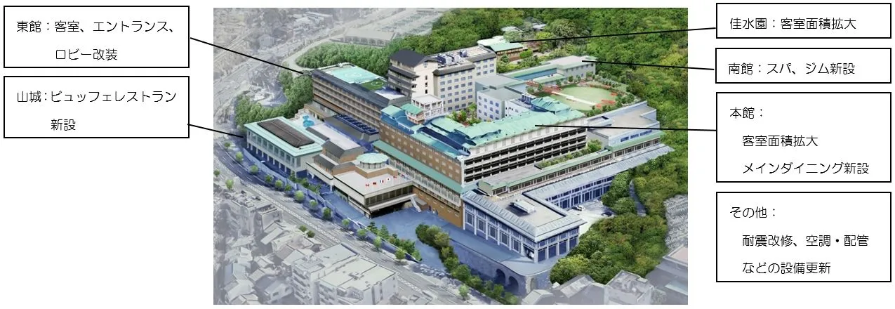 | ・平均客室面積を約50平米に拡大し、京都・東山の自然をイメージした内装デザインとして、浴室すべてに独立した洗い場を設けます。 ・ホテル敷地内で掘削する温泉を活用した約1,000平米のスパを新設し、華頂山に続く庭園と一体となった半露天風呂で、日本らしいくつろぎ感を楽しんでいただけます。 ・海外からのお客さまにも人気の数寄屋風別館「佳水園」は、原設計を承継しつつ客室面積を大幅に拡大し、浴室では温泉もお楽しみいただけます。 ・本格的なフランス料理を提供するメインダイニングや、ライブキッチンなどを備え京都市街を一望できるビュッフェレストランが誕生します。 |