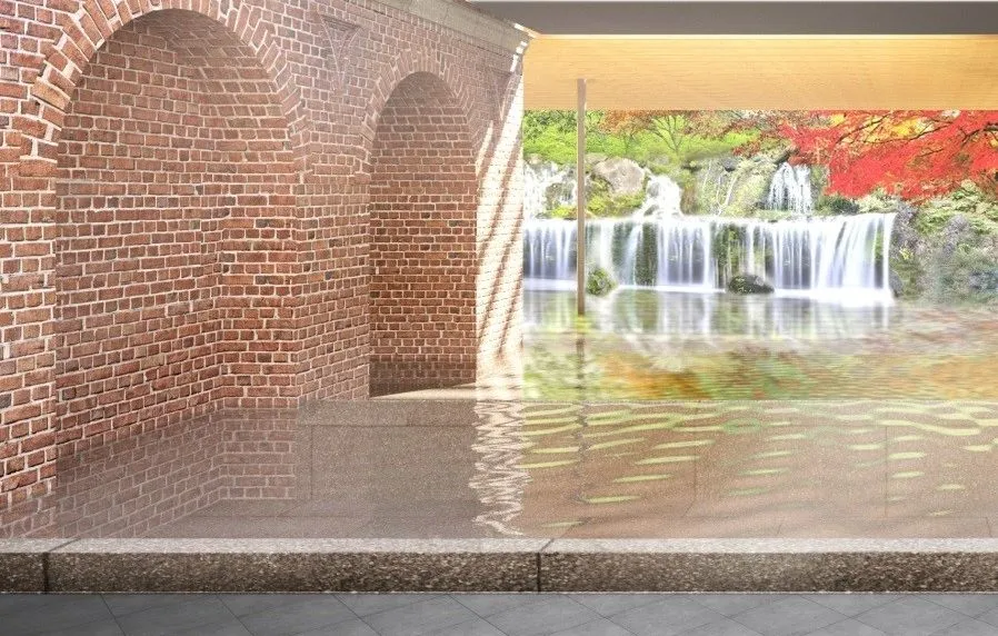 総面積約1,000平米のゆったりとした空間に、水路閣をイメージしたデザインをあしらった、華頂山に続く庭園と一体となる半露天風呂を配するなど、日本の温泉文化を感じていただけます。
