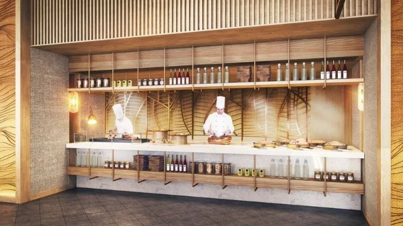都ホテルの伝統あるフランス料理をさらに磨き上げて提供するメインダイニングを設けます。また、京都市街の景観を楽しんでいただけるよう北側一面をガラス張りにし、ライブキッチンなどを備えたビュッフェレストランを新たに設けるなど、宿泊以外のお客さまにもご利用いただきやすいレストラン構成とします。