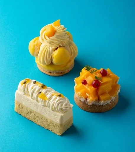 ココナッツ風味のタルトに、たっぷりのパティシエールとフレッシュマンゴーをのせ、アクセントにグロゼイユ(赤スグリ)をあしらった夏らしく鮮やかな一品。