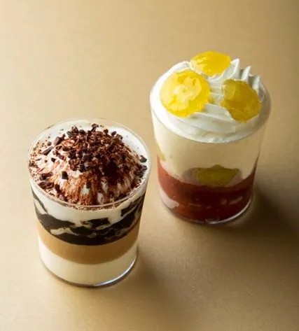 ラム酒風味のババロワ、コーヒーのムースとジュレ、濃縮したミルクのジュレにシャンティを重ねた大人のヴェリーヌ。
