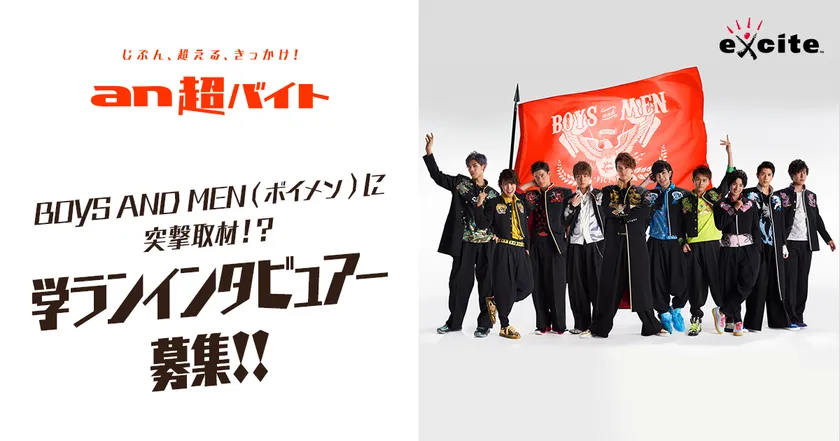 「an超バイト」とエキサイトニュースがコラボしてお届けする、アーティストインタビューバイト企画シリーズの第4弾! 今回は、東海エリア出身・在住のメンバーで構成されたエンターテイメント集団「BOYS AND MEN(ボイメン)」の“あの注目の3人”に、ボイメンのトレードマークでもある学ラン姿でインタビューする“学ランインタビュアー”を2名募集します。採用された方には、「BOYS AND MEN(ボイメン)」が9月12日にリリースするニューシングル『炎・天下奪取』の魅力についてお伺いする個別取材で、「an超バイト」×エキサイトニュースのインタビュー企画のサポートスタッフとして、取材現場に参加していただきます。報酬として日給3万円、さらにメンバーサイン入りオリジナルグッズが贈呈されます。