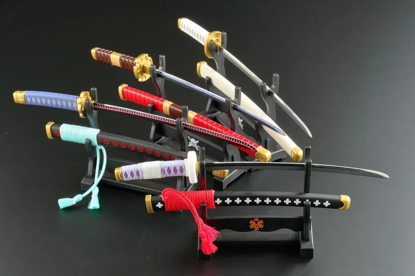 ワンピースペーパーナイフは、ゾロの愛刀「和道一文字」「三代鬼徹」「秋水」と、ローの愛刀「鬼哭」をモデルに作り込んでおり、それぞれ刃紋や鍔の形状、鞘の形状までリアルに再現しております。
