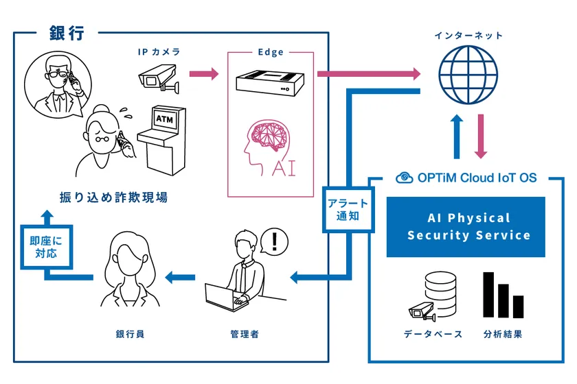 AI・IoT・ビッグデータプラットフォームのマーケットリーダーである株式会社オプティム(以下 オプティム)は、株式会社佐賀銀行※1(以下 佐賀銀行)ATMコーナーにおいて、ATMによる振り込め詐欺を未然に防ぐ対策として、AI監視カメラサービス「AI Physical Security Service」を利用した「ATMコーナー監視システム」の実用化に向け実証実験を開始いたしました。