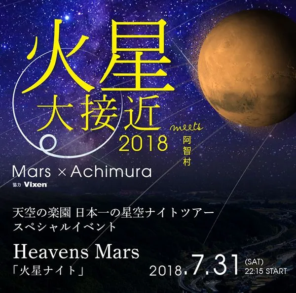 総合光学機器メーカー株式会社ビクセン(本社:埼玉県所沢市、代表取締役:新妻和重)は、2018年7月31日(金)に開催される『火星大接近を見よう!3箇所同時開催! in 日本一の星空阿智村』に協力します。