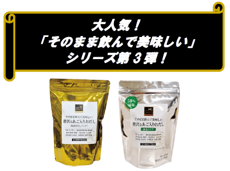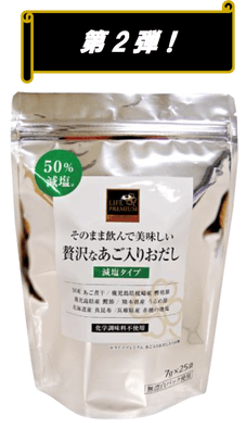 第1弾の「あご入りおだし」を50%減塩した商品。