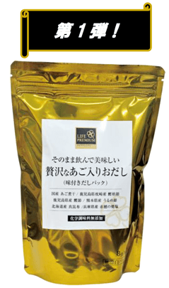 第1弾の「あご入りおだし」、第2弾の「あご入りおだし減塩タイプ」は国産の素材にこだわり簡単に風味の良いおだしがとれるとテレビでも紹介され、累計販売個数34万個を突破した大人気商品です。