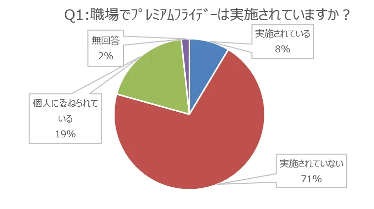 会場来場者に「職場でプレミアムフレイデーは実施されていますか?」という質問をしたところ、「実施されている」が8%、「実施されていない」が71%と、多くの企業では実施がされていない実態が分かりました。(図1)