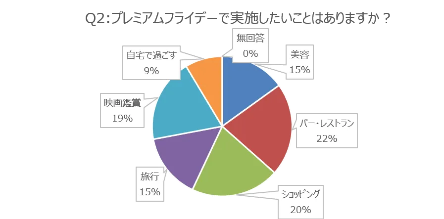 プレミアムフライデーの実施の有無にかかわらず、「プレミアムフライデーで実施したいことはありますか?」という質問に対しては、無回答は0%、「バー・レストラン」が22%と最も高い意向があり、「ショッピング」20%、「映画鑑賞」19%、「美容」15%など、どの項目も回答が多く、実施してみたいことはあるという結果になりました。