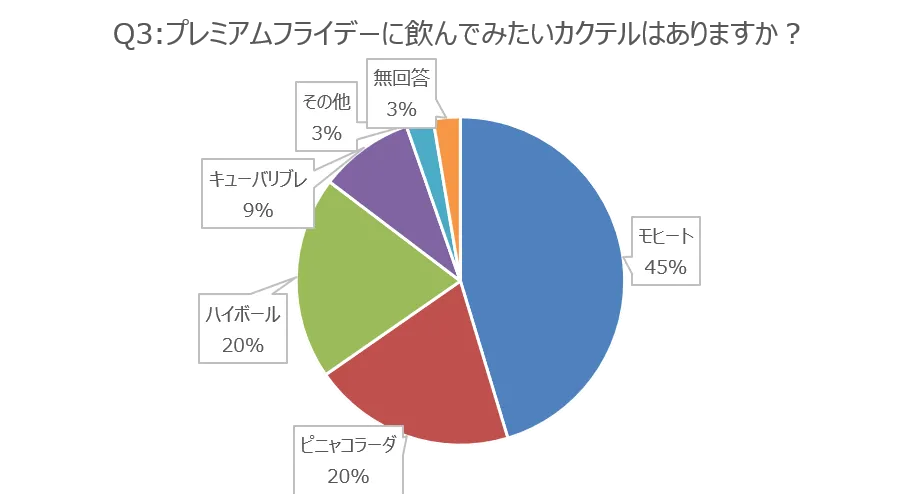「プレミアムフライデーに飲んでみたいカクテルはありますか?」の質問に対しては、「モヒート」が多くの票を集め45%、次いで「ピニャコラーダ」20%、「ハイボール」20%という結果でした。