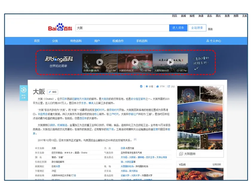 百度で「大阪」を調べると、百度百科は検索結果の上部に必ず露出するためSEO対策にも直結します。大阪の観光・文化・歴史・経済など幅広い情報を集約したプロモーション動画を百度百科に掲載することで、中華圏視聴者に情報を届け、観光客のみならずビジネス目的の人まで大阪に呼び寄せることが可能となります。