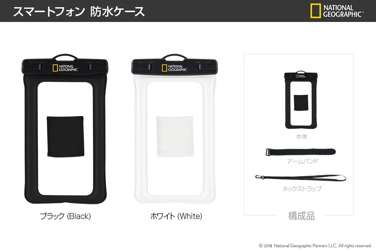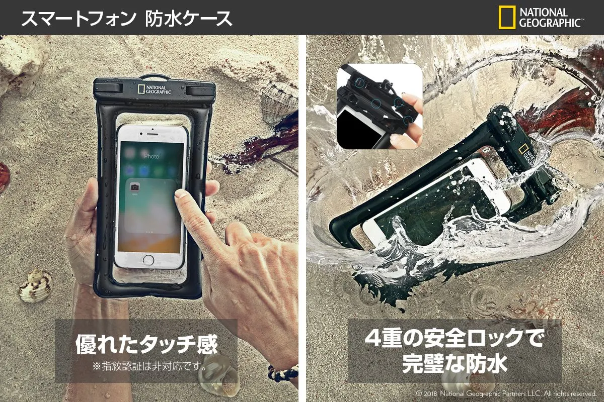 本製品は、ナショナル ジオグラフィックのロゴデザインを施したおしゃれで高機能なスマートフォン用防水ケースです。海や山、プールなどのレジャーやアウトドア、夏フェスのファッションの一部として大活躍します。少額のお金や、6.3インチまでの大きめのスマートフォンが収納できます。