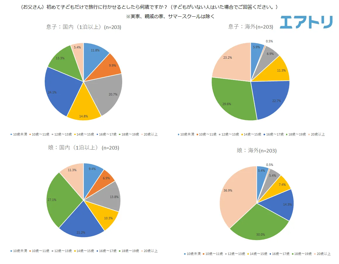 お父さん目線の回答とお母さん目線の回答を比較したところ、お母さんの方が早い段階で子どもだけの旅行に行かせてもいいと考える人が多く、娘の海外旅行においては「10歳未満」から「14歳~15歳」の合計が、お父さんは「18.7%」なのに対しお母さんは「25.2%」と6.5%もの差がでました。