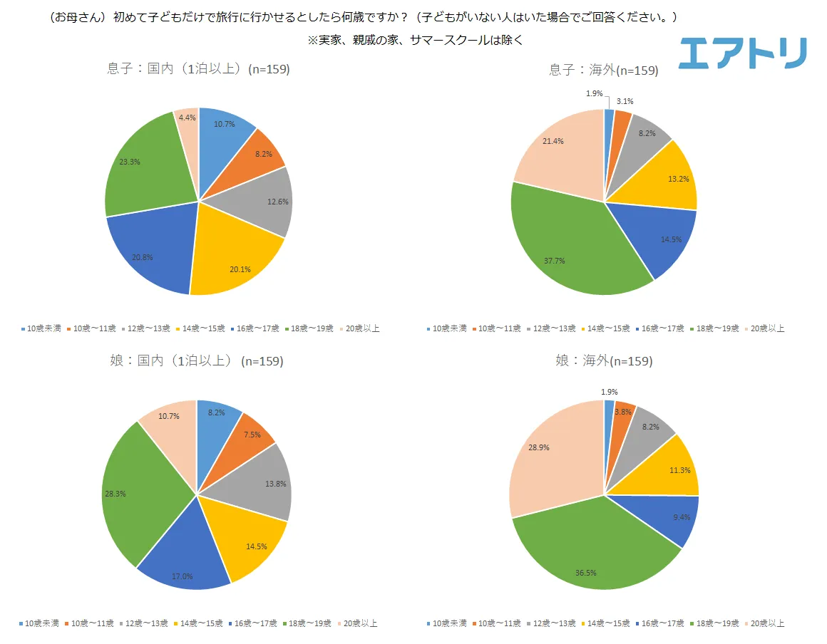 国内旅行では、息子・娘ともに「18歳~19歳」(息子:22.6%、娘:35.5%)が最も多く、約9割が10代の内に子どもだけの国内旅行を経験していることが分かりました。