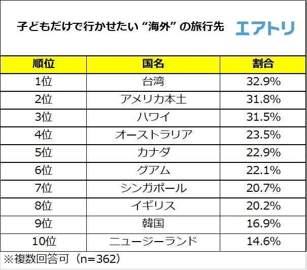 オンライン総合旅行サービス「エアトリ」(http://www.skygate.co.jp/)を運営する株式会社エアトリ(本社:東京都新宿区、代表取締役社長:吉村 英毅、以下エアトリ)は、10代~70代の男女362名を対象に「子どもだけの旅行」に関する調査を実施しました。