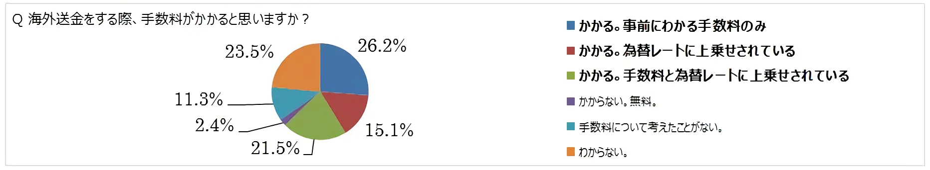 ⇒海外送金をする際に「事前にわかる手数料のみ」と回答した人が26.2%、「為替レートに上乗せされている」と回答した人が15.1%、「手数料と為替レートに上乗せされている」と回答した人が21.5%という結果でした。実際には、銀行をはじめ多くの機関では、手数料と合わせて為替レートにも上乗せされている為2重の手数料が掛かっているので、その事実を理解している人は約2割しかいませんでした。