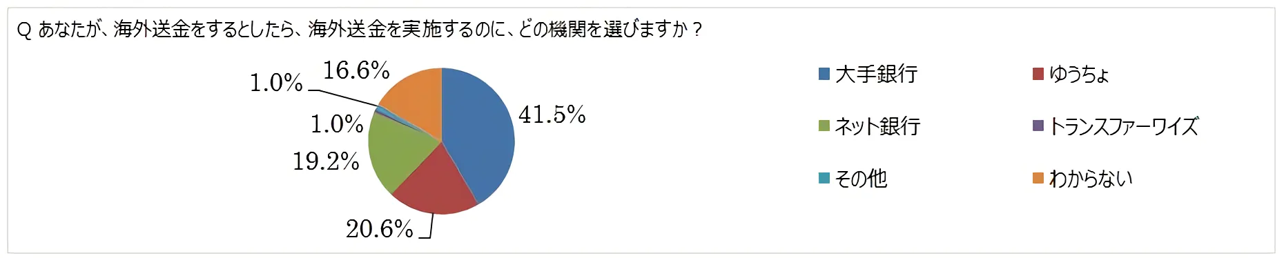 ⇒海外送金をする際に選ぶ機関についての質問には「大手銀行」が41.5%、「ゆうちょ銀行」が20.6%、「ネット銀行」が19.2%という結果でした。大手銀行をはじめ多くの金融機関は手数料を安くみせるために、為替レートに手数料を上乗せしているため、とても多額のコストがかかります。しかしながら、約4割の人が海外送金の際に大手銀行を選んでしまっています。