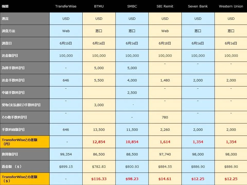 銀行ではトランスファーワイズと比較すると、約100$の差額が出る結果に!