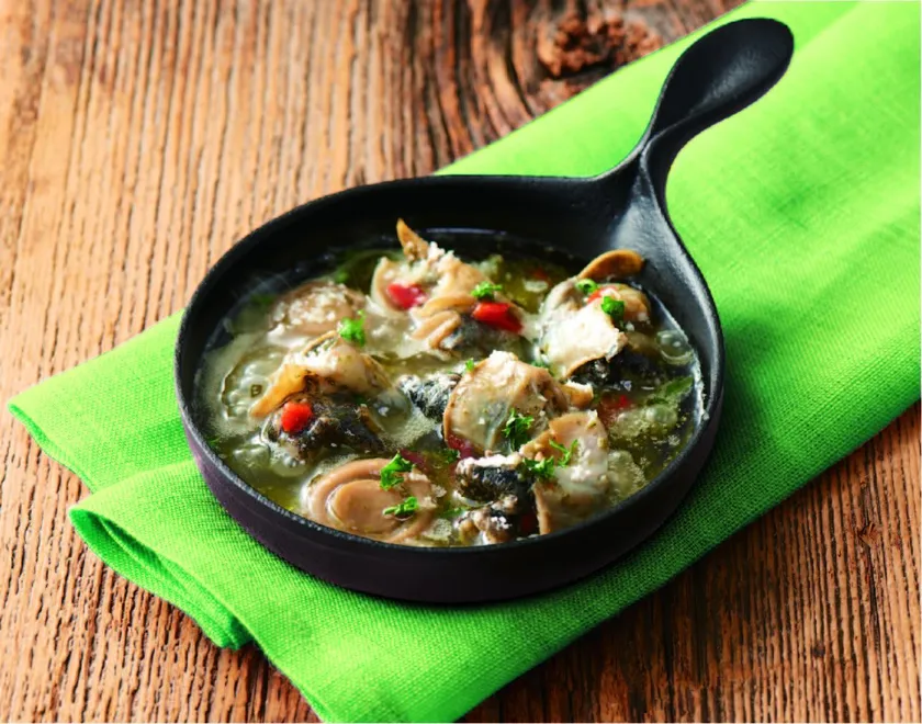 北海道産つぶ貝とマッシュルームを、香り高いバジルとチーズのコクが引き立つアヒージョにしました。