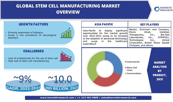 世界の幹細胞製造市場の成長は、2022年から2031年の間に約9%のCAGRで人口と研究者の間で生物製剤に関連する意識の高まりによって推進される
