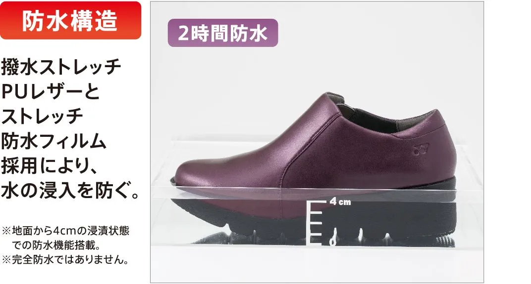 アッパーには撥水ストレッチPUレザーとストレッチ防水フィルムを採用。水の浸入を2時間防ぐ防水構造で、急な雨天時にも安心してお履きいただけます。