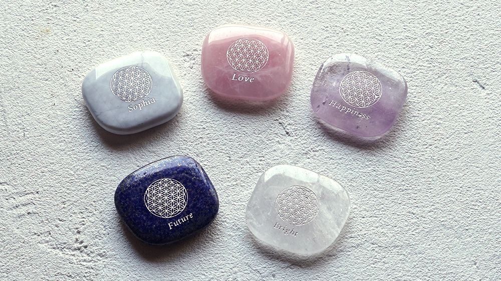 クリスタル、アメジスト、ローズクォーツなど5種類の天然石に、フラワーオブライフとメッセージを刻印したお守り石。