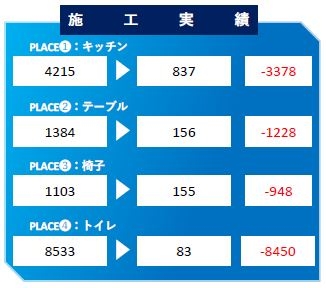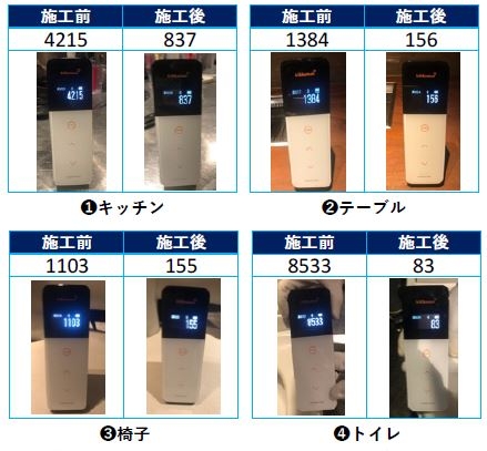 試験方法:ATPふき取り検査(A3法)※で作業前後の汚れの数値を計測したところ、作業前と比べて作業後の数値が大幅に減少しており、高い抗菌・抗ウイルス効果を生んだことが分かります。光触媒は蛍光灯などの光が当たると、抗菌・抗ウイルス作用が発生します。よって、コーティング後は日常生活を送るだけで、この数値はどんどん下がっていきます。
