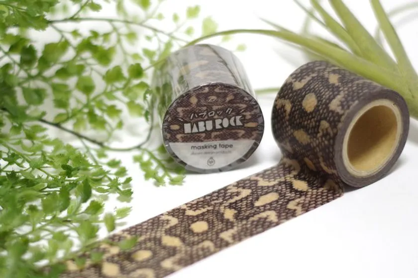 『HABU ROCK マスキングテープ 銀ハブ ダイバン』は奄美大島産の本ハブ革を丁寧になめした「銀ハブ」の柄とサイズ感を忠実に再現しています。ハブのショーや展示を行っているハブの革骨加工専門店「原ハブ屋奄美」の協力により、商品化することができました。