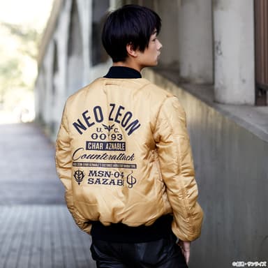 「シャア・アズナブルモデル」の表面は搭乗するモビルスーツ“サザビー”をイメージした鮮明なレッドカラー。右胸にはシャア・アズナブルのパーソナルマークと“サザビー”の機体番号「MSN-04」を記載したワッペンを配置。右腕にはシャア・アズナブルの所属する組織“NEO ZEON”のマークを表現したワッペンを配置しています。また、裏面はイエローベースの生地に、大きくロゴを入れたこだわりの仕様となっています。