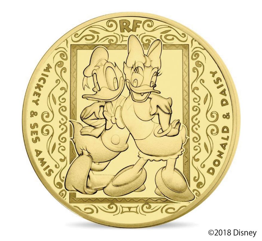 7.78グラムの50ユーロ金貨の裏面には、ドナルドダックとデイジーダックが描かれています。二人は仲良くお互いの肩を寄せ合っています。