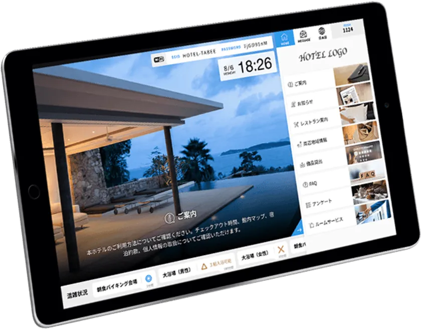 宿泊者は客室内で自由にタブレットを利用、閲覧することができます。「施設案内」「観光情報」などの閲覧をはじめ、「各施設(大浴場・レストランなど)の混雑状況の把握」「ルームオーダー」などが行え、快適な客室体験の提供をサポートいたします。