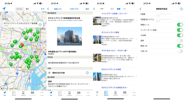 地図や現在地周辺、エリア、鉄道路線沿線から、宿泊予約サイト「じゃらん」「楽天トラベル」が提供する宿泊施設が検索でき、宿泊プランページからそのまま予約をすることができます。