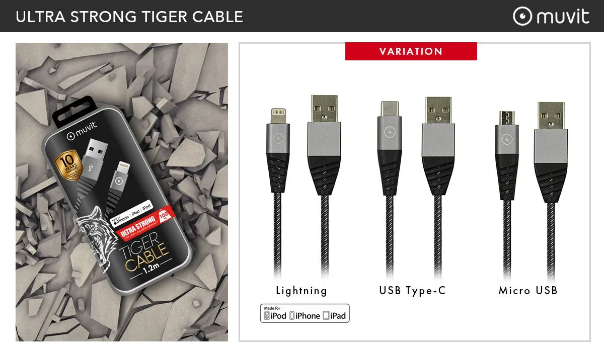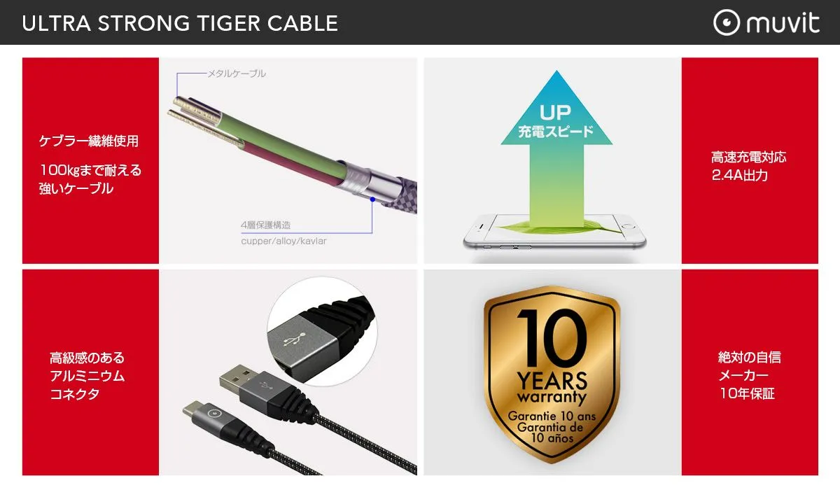 モバイル周辺アクセサリー専門の株式会社ロア・インターナショナル(所在地:東京都新宿区、代表取締役社長:Ally Won)は、フランス生まれのブランドMuvit(ムービット)から5万回の屈曲試験に耐える、10年保証の、どんな使用環境でも断線しない充電ケーブル「ULTRA STRONG TIGER CABLE(ウルトラ ストロング タイガーケーブル)」を発売しました。