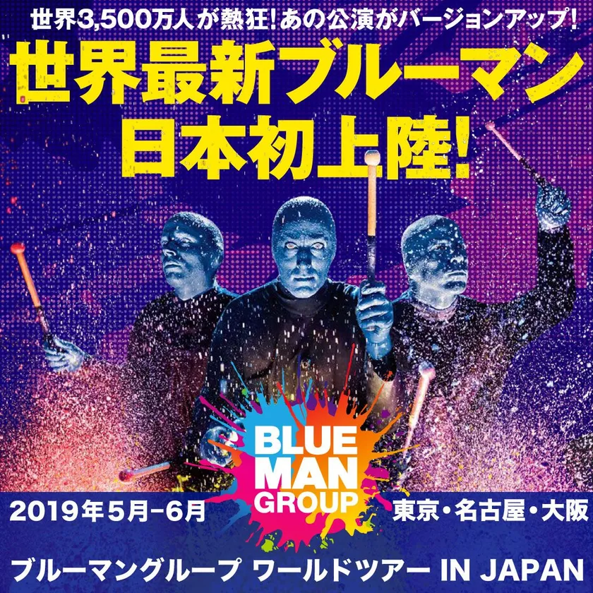 2007年から2012年の間に、通算1,388公演、動員数80万人を記録した異次元の“アート・パフォーマンス・エンターテインメント”BLUE MAN GROUPが、来年2019年に再度来日し、スケールアップした“ワールドツアー”として日本初上陸いたします。平成に代わる新元号がスタートする2019年5月に東京、6月に名古屋と大阪に、世界を魅了する3人の青いパフォーマーによるエンターテインメント・ショーがやってきます。