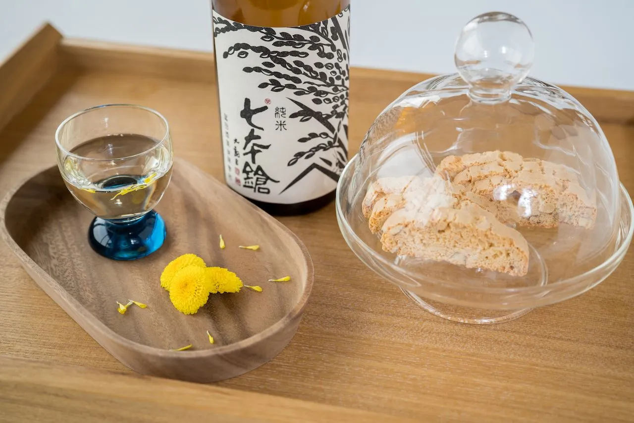 夕食後の山床カフェでは、食後の時間を月見酒とお月見スイーツを食べながら、秋の夜長を楽しむことができます。月見酒には、滋賀県を代表する冨田酒造の特別熟成酒「無有(むう)」を用意します。「無有」は、1年半前から仕込み、9月解禁の無農薬米で作る熟成酒です。これに季節の食用菊をあしらいます。スイーツには、冨田酒造の酒粕を使ったビスコッティをあわせて、お休み前のひと時を楽しむことができます。