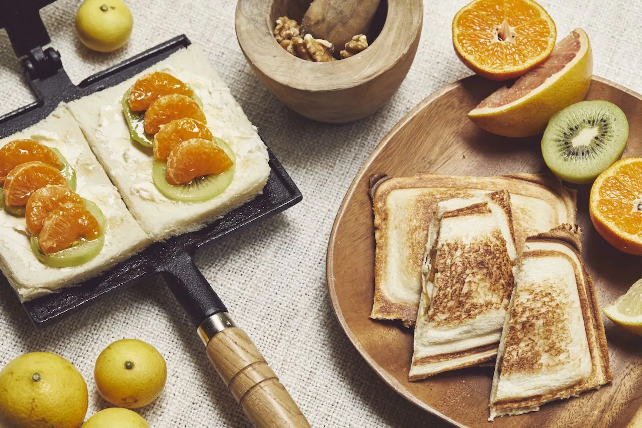 伊豆地域では、斜面の多い土地の形状や温暖な気候から柑橘類の栽培が盛んとなっています。秋から冬にかけて収穫時期を迎えるみかんは、クリームチーズと共にパンに挟んで焼き上げる「シトラスホットサンド」として提供。熱を加えることで甘みが強まったみかんと、とろけるチーズの相性の良い組み合わせが楽しめます。その他、みかん、ぶどう、柿、りんごなど数種類のフルーツを約30cmの長さの串に刺した「フルーツシュラスコ」も用意します。