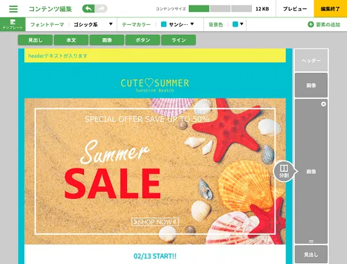 主な特徴は、業種や活用シーン別に用意された複数のテンプレート。ニーズにあったデザインを選択しテキストや画像を入力するだけで、より手軽に簡単にデザイン性の高いHTMLメールを作成できます。