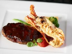 (ハンバーグステーキ、イセエビのグラタン)