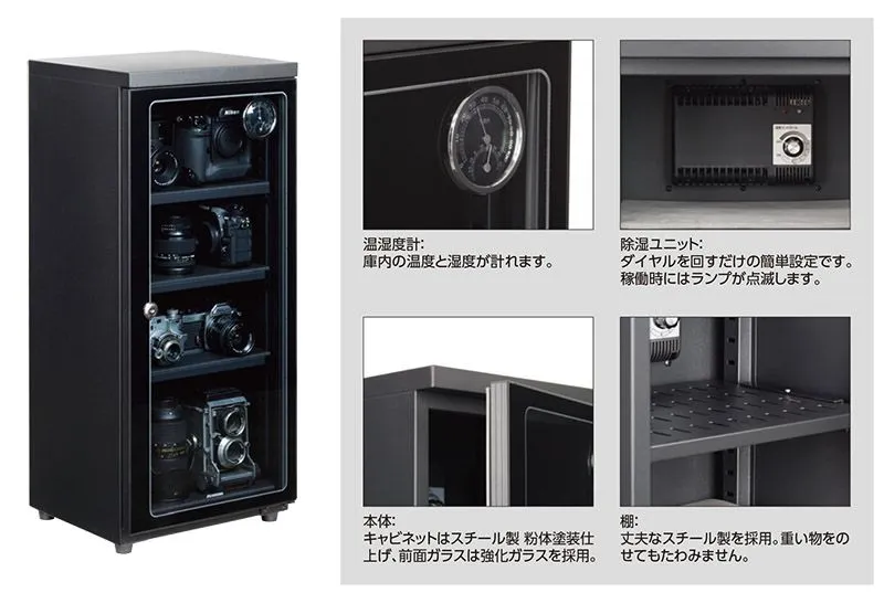 「E-ドライボックス」シリーズは、カメラをディスプレイしながら湿気やホコリから守る電子式防湿保管庫です。ダイヤル設定自動調整式で、防湿庫の中の湿度を簡単に一定に保てます。ガラス張り扉なのでカメラ、レンズのディスプレイにもなります。