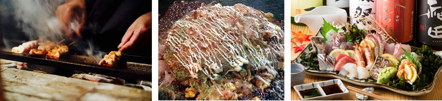 〈焼き鳥 松元/鶴橋 お好み焼・鉄板焼 オモニ/長浜鮮魚卸直営店 博多 魚助 イメージ〉