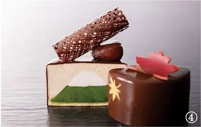 中から日本の象徴とも言える「富士山」が!栗のムースの表面は漆器をイメージして艶(つや)を出し、金箔で紅葉(もみじ)をあしらった、目でも楽しめるデザートです。日本らしく雅(みやび)やかなケーキをお楽しみください。