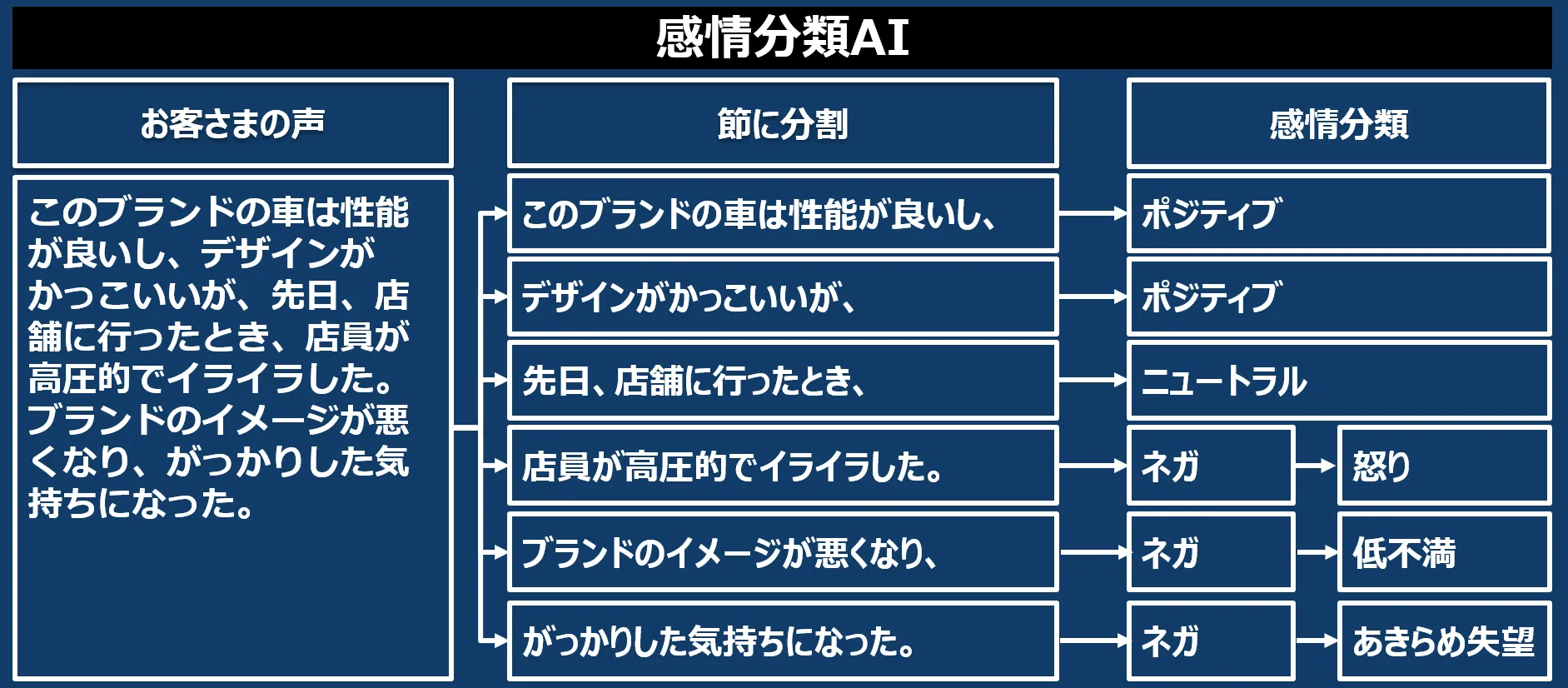 生活者や顧客の声の中には、「美味しいけど高い」、「好きだけどがっかりした」など、ポジティブの感情とネガティブの感情が混在していることが多いのが実情です。これまでの感情分類AI(バージョン1)は、ネガティブな意見の分類には優れていましたが、多くの企業から、「不満に限らないフラットな文章も活用したい」とのご要望を頂きました為、より多くのシーンでご活用頂ける「節単位での感情分類モデル」(バージョン2)を開発しました。