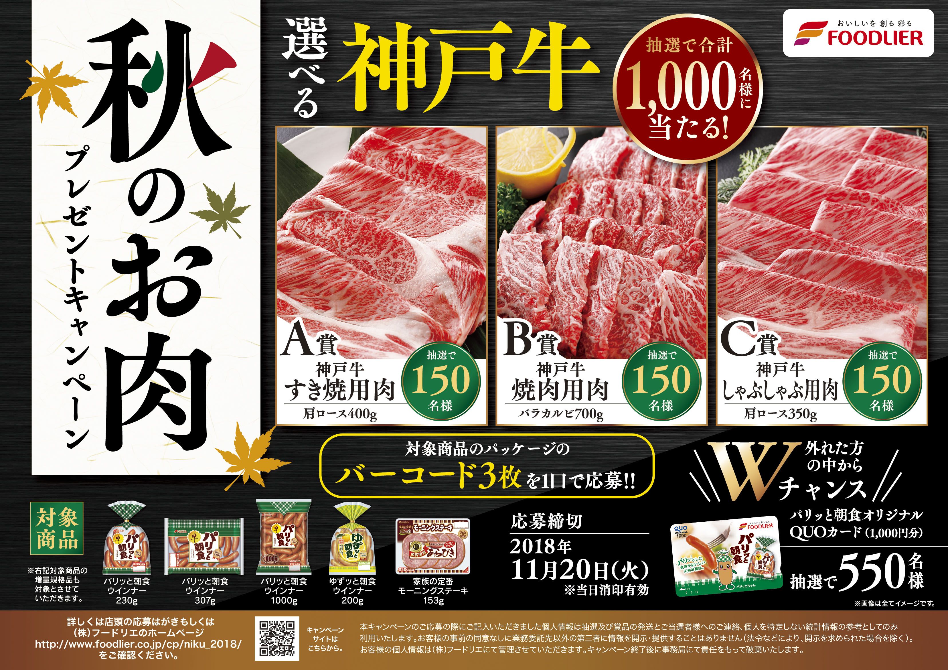 株式会社フードリエ(本社:大阪府高槻市、代表取締役社長:石野 克彦)は、2018年9月1日(土)~11月20日(火)までの期間で、『秋のお肉プレゼントキャンペーン』を実施いたします。