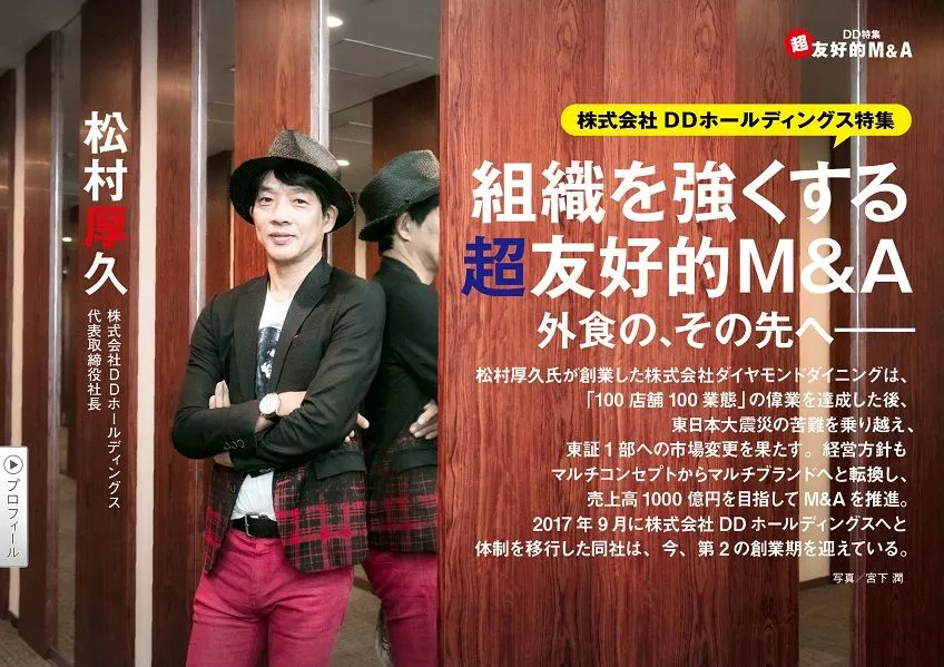 松村厚久氏が創業した株式会社ダイヤモンドダイニングは、「100店舗100業態」の偉業を達成した後、東日本大震災の苦難を乗り越え、東証1部へ市場変更。経営方針もマルチコンセプトからマルチブランドへと転換し、外食産業の壁と言われた売上高300億円を突破。2017年9月に株式会社DDホールディングス(DDHD)へと体制変更した同社は、売上高1,000億円を目指してM&Aを推進しています。