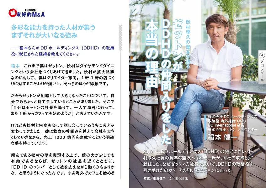 今号では、松村社長のインタビューをはじめ、ゼットン創業者で現在はDDHDの海外事業を総括する稲本健一氏や、外食産業に詳しい投資アナリスト、同社グループの人材開発を一手に担うグループ人材開発室への取材を通して、第2の創業期を迎えているDDグループの全容を解明。