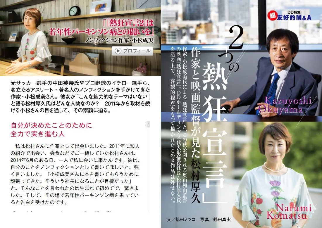 作家・小松成美氏による松村社長のノンフィクション『熱狂宣言』と、11月に公開される奥山和由氏(チームオクヤマ)監督のドキュメンタリー映画『熱狂宣言』。DDホールディングス代表取締役社長・松村厚久氏を語る上で、客観的視点をもって描かれたこの2作品は外せない。