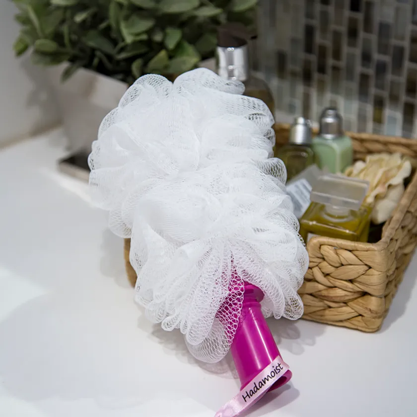 Hadamoistを持つと意外とコンパクトに感じられますが、しっかり背中まで洗える設計になっています。手首を軽く返すだけでネットが転がるので、体が硬い方でも十分な範囲をカバーできます。