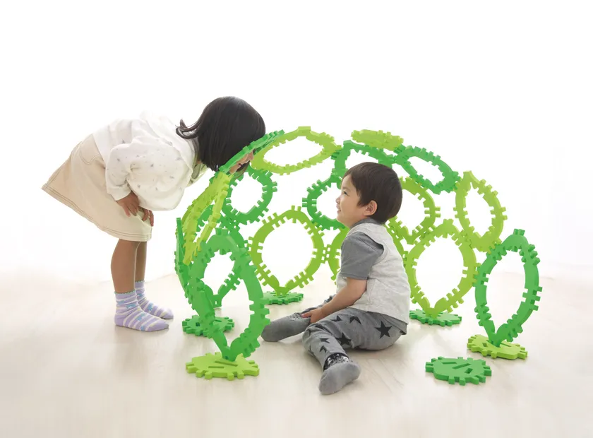 こどもは自分だけの特別な空間が大好きです。このセットは「葉っぱ」をモチーフにしたパーツを組み合わせることで、ドーム型のお家を作ったり、自分だけのお庭を作ったり、トンネルを作ったり、アイデア次第でいろいろな形に組んで遊ぶことができます。また葉っぱを道のようにつなげて、ケンケンパも楽しめます。